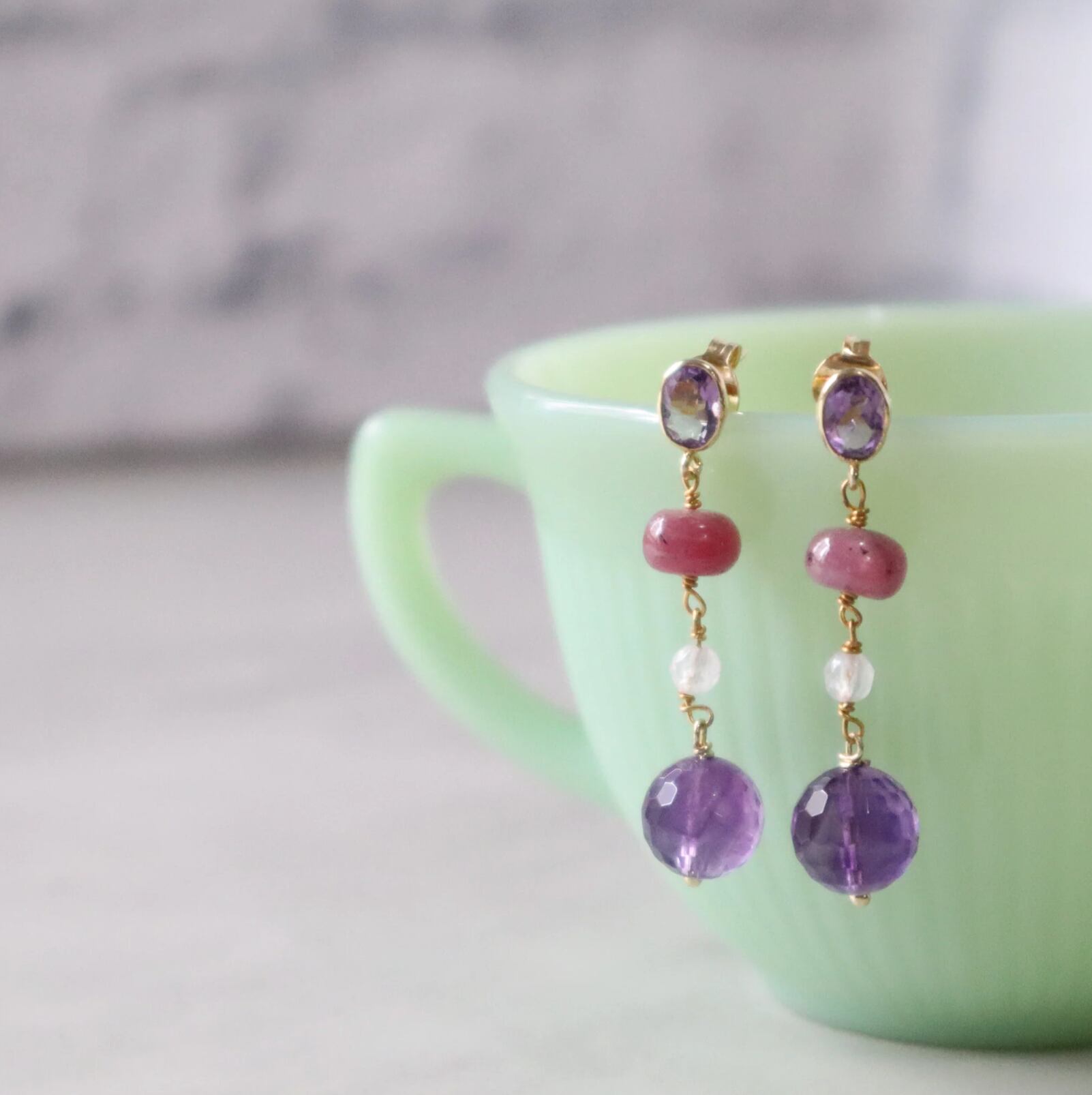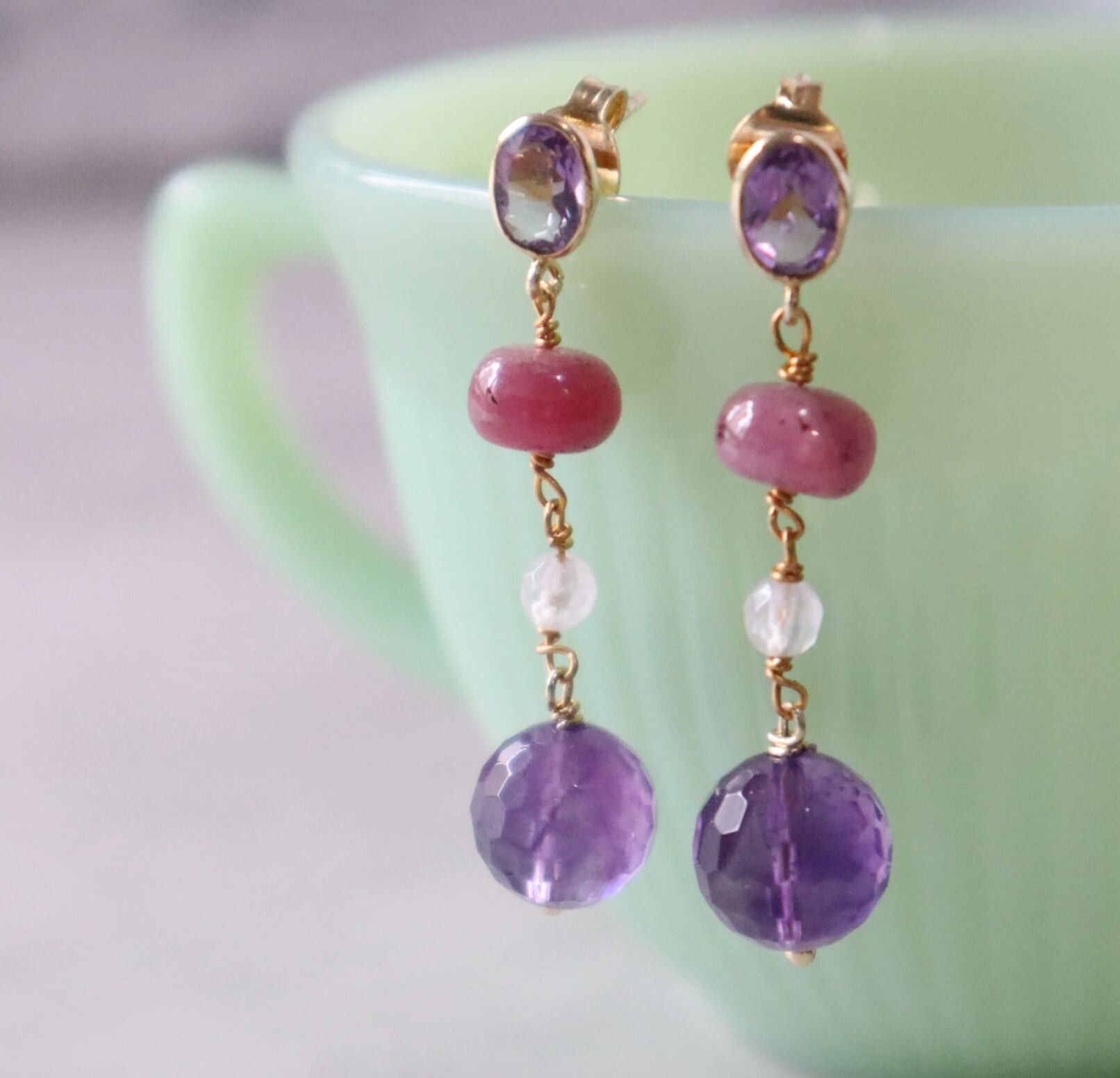 アメジストのキラキラとしたカットと ぷっくりとしたルビーのツヤ感に引き込まれます。