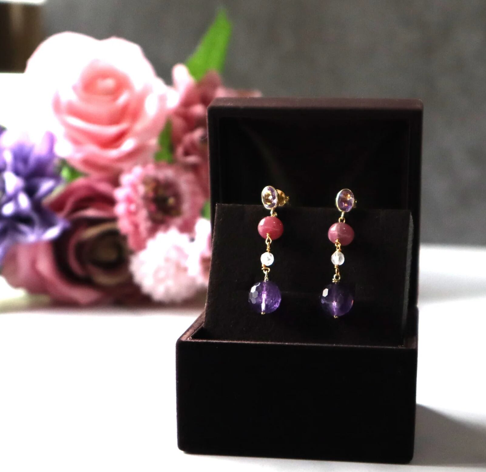 愛しさの源 天然石ピンク&パープルピアス ルビー・アメジスト・ローズクォーツ